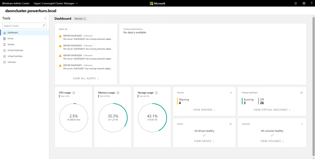 Sobald alle Voraussetzungen für den Betrieb erfüllt sind, können Sie unter anderem solch eine Übersicht über Ihr S2D Cluster haben: