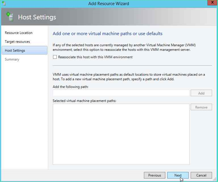 Auf der Seite Host Settings können wir die Voreinstellungen übernehmen (die Option Reassociate this host with this VMM environment ist nur in Verbindung mit Active Directory Computern von Bedeutung; für Standalone Hosts spielt sie keine Rolle).