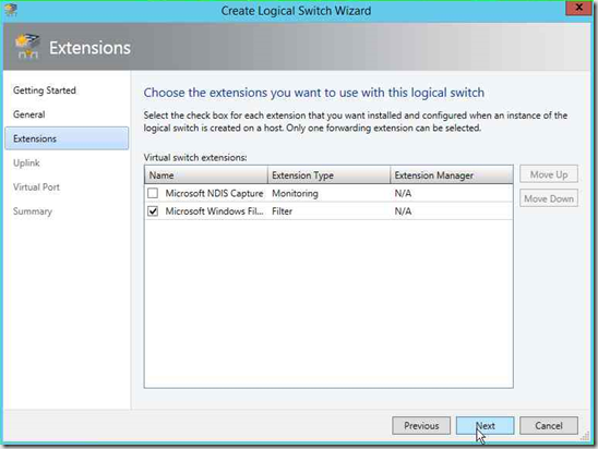 Ein logischer Switch ist eine Zusammenstellung von Port Profiles, Uplink Port Profiles und Port Classifications, die auf die physischen Netzwerkadapter unserer Hosts angewendet werden kann. Ein logischer Switch kann auch Erweiterungen enthalten für zusätzliche Switch Funktionen wie das Überwachen, das Filtern oder das Weiterleiten von Datenpaketen. Microsoft liefert mit dem VMM bereits einige Erweiterungen aus. Zusätzliche Erweiterungen können von Drittanbietern entwickelt und in die VMM-Umgebung eingebunden werden (Beispiel: Cisco Nexus 1000V).